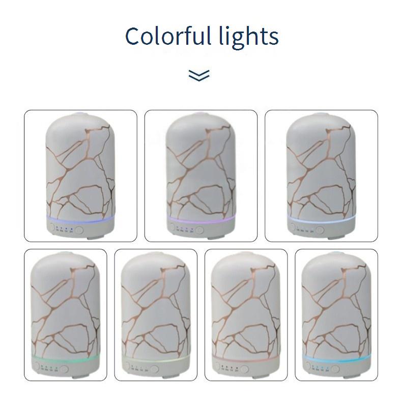 Modern white ceramic diffuser with elegant gold-vein lines. Ultrasonic cool mist refreshes dry air and spreads essential oils while a gentle night light sets a calm mood—quiet, stylish, and perfect for bedrooms, offices, and spa corners.
