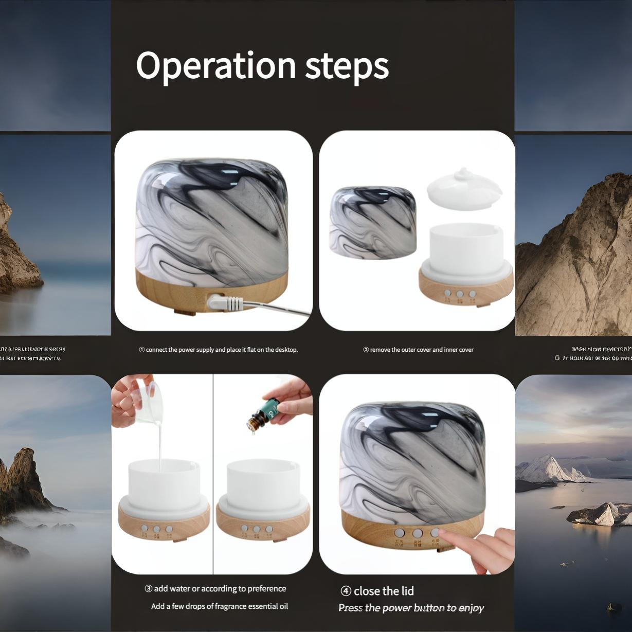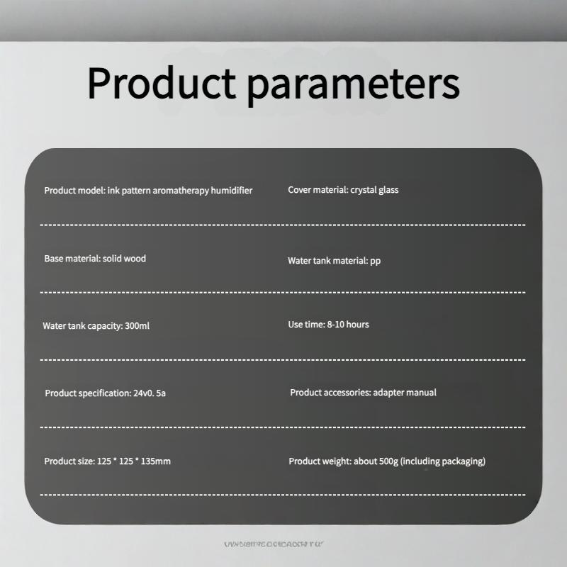Elevate your space with a striking ink-swirl crystal glass cover set on a warm solid-wood base. This ultrasonic aroma diffuser delivers a fine, cool mist to refresh air while a gentle night light (three brightness levels) sets the mood. One-tap start, independent mist/light controls, timer options, and auto shut-off make it a calm, worry-free addition to bedrooms, offices, and spa corners.